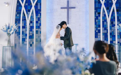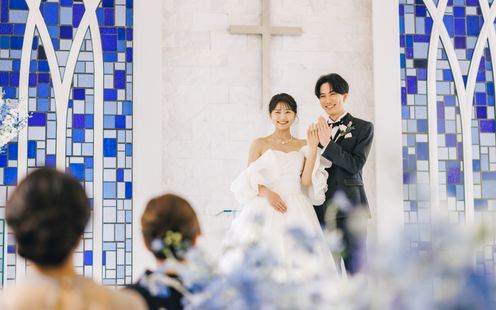 北近畿エリア最大級!天井高10Mの独立型チャペル≪アンジュ・ド・ボヌール≫。 誓いの場に相応しい白亜の大空間に、シンガーの歌声やピアノ、フルートの音色が優しく響き渡ります。ブルーのステンドグラスにちなんで “サムシング・ブルー”をテーマにした光の演出も、挙式の感動をより高めるオリジナル演出! シルエットを使った特別なベールダウンやまるで天使がふたりを祝福するような特別な演出で驚きと感動を。