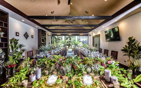 【緑と光に包まれたアジアンリゾート】木のぬくもりと緑に包まれたバリ風の<Plumeria (プルメリア)>では、おふたりとゲストを穏やかな空気で包み込むアットホームなウエディングが叶います。親しい人たちと集うにふさわしいナチュラルスタイルの空間で、ありのままで楽しめる最幸のひとときを。会場には専用テラスを併設し、動きのあるパーティーも実現可能。木目の美しさを活かした落ち着きのある非日常空間で、和やかな時間をお過ごしください。