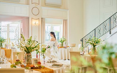 幸せな空間の名をもつラグジュアリーなパーティー会場<Fearia(フェアリア)>。おふたりが大階段から舞い降りれば、そこは歓喜に包まれた光あふれる明るい貸切邸宅に。オリジナルのプロジェクションマッピングを用いた演出で、さらにパーティーが盛り上がります。ホワイエや開放的なテラスまでを贅沢に使って、ふたりらしいオリジナルパーティを叶えましょう。