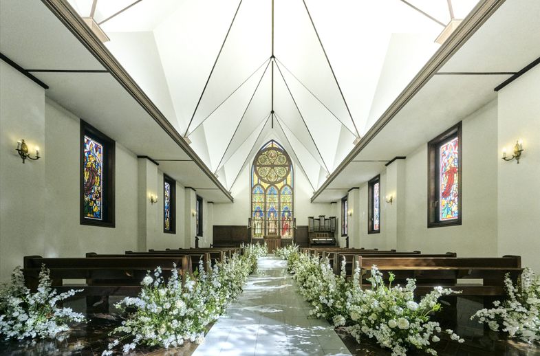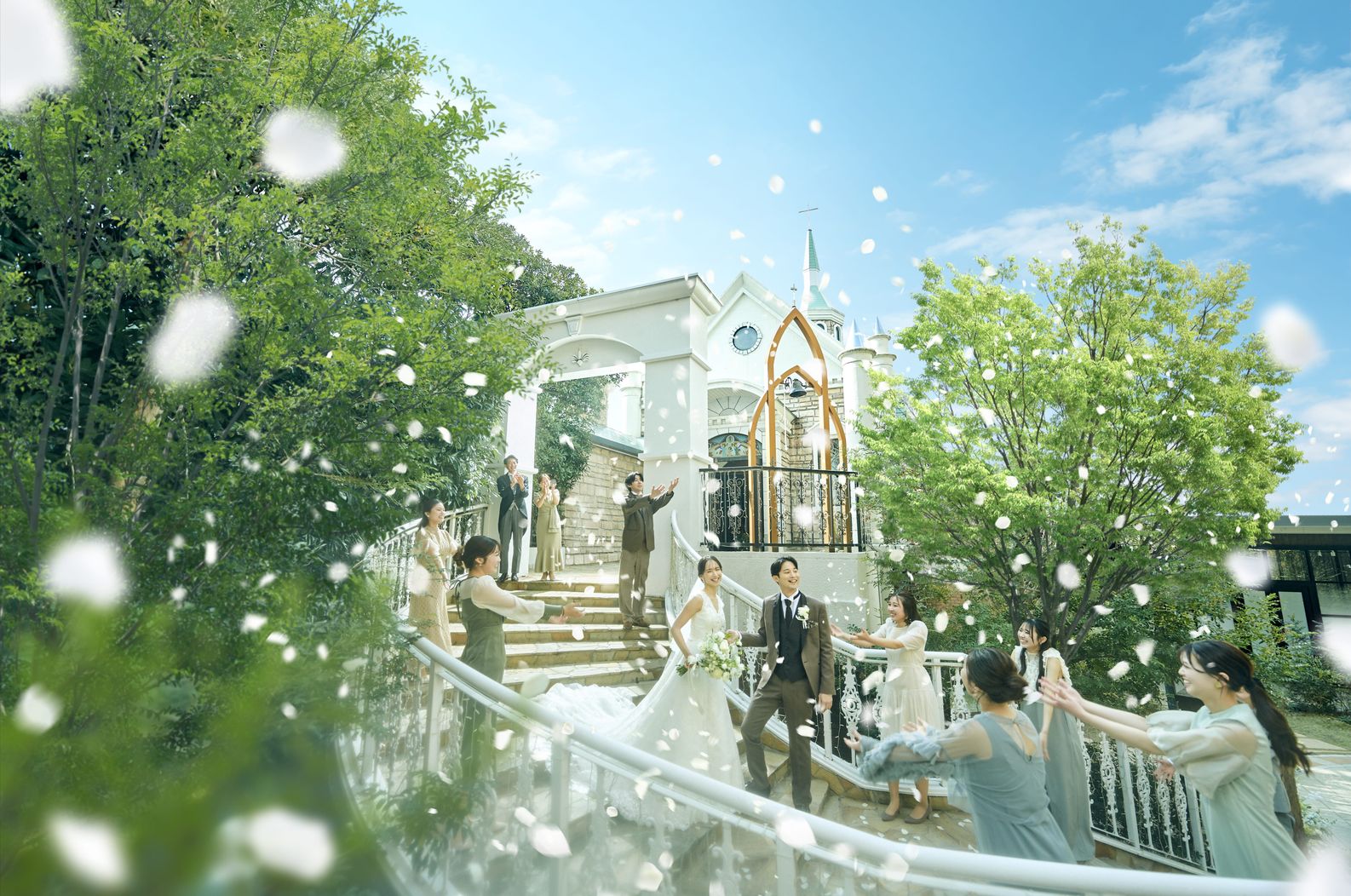 01.【独立型チャペル】ステンドグラスの下で感動挙式。石造りの螺旋階段でフラワーシャワーを