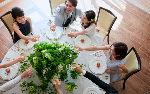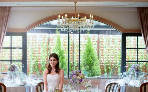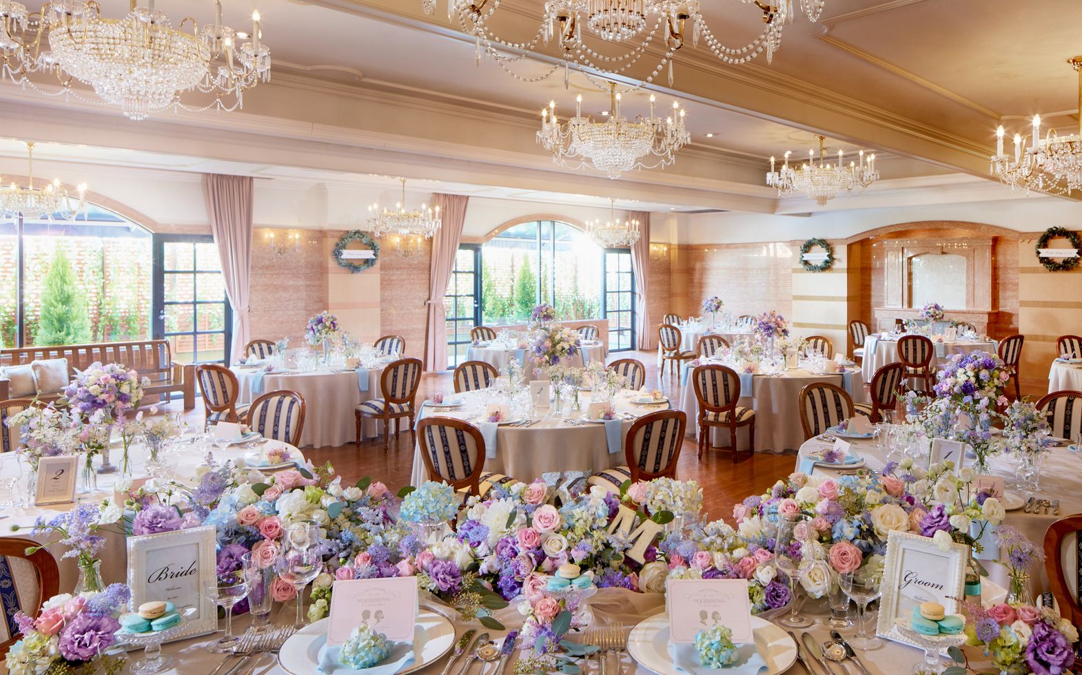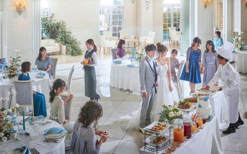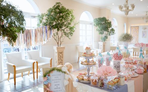 自然光が入る明るい会場。緑と光が溢れるナチュラルさ、シャンデリアがきらめくスタイリッシュさが調和した披露宴会場。専用のテラスではウェルカムドリンクや色とりどりのデザートビュッフェでおもてなしを。
