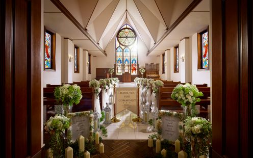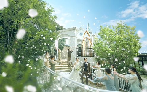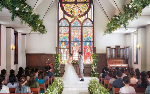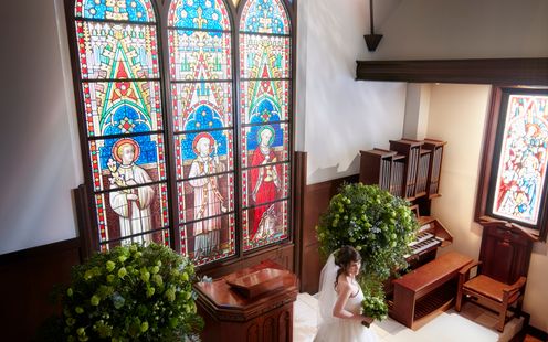 独立型チャペルは、フランスの小さな村にある教会のような温かな雰囲気。アンティークのステンドグラスからこぼれる幻想的な光とパイプオルガンの調べに包まれて、感動的なセレモニーが叶います。挙式スタイルは教会式・人前式に対応。挙式後は大階段でアフターセレモニーをお愉しみいただけます。また、同館では神殿での古式ゆかしい神前式も可能。伝統的な儀式に則って、家族の絆を大切にした結婚式を執り行えます。