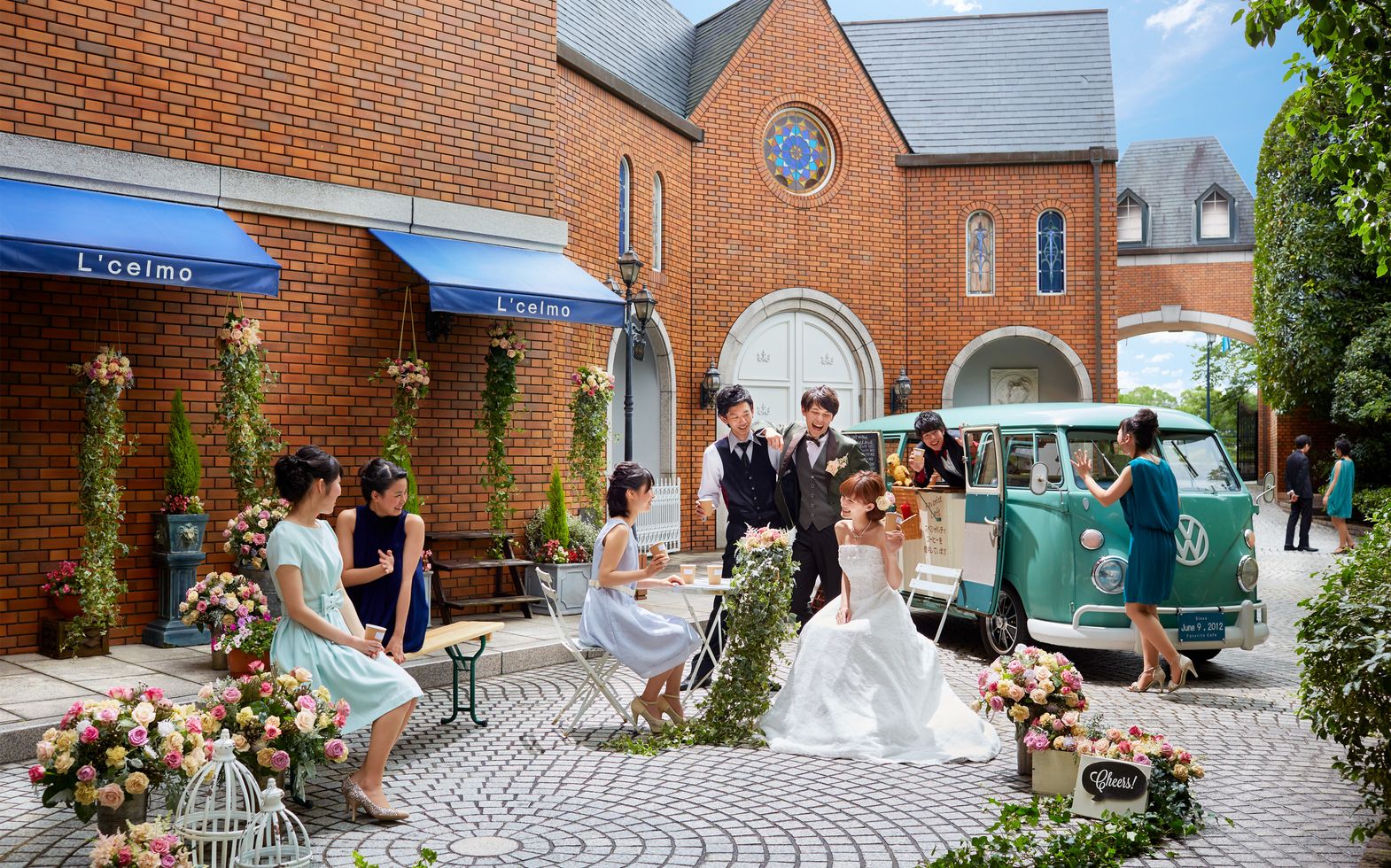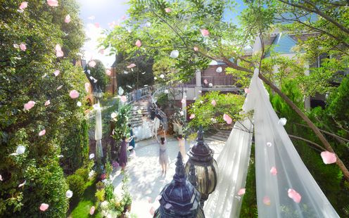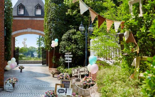 ヨーロッパの街並みをイメージした石畳のガーデンでゲストと笑顔あふれるひとときを