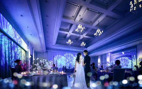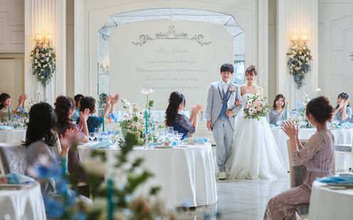 花嫁のピュアな心をイメージした陽光が差し込む明るい披露宴会場には160名着席可能。フロア全体を貸しきることが出来るので、演出やコーディネートはおふたりの個性とアイデアがあふれるパーティーに。