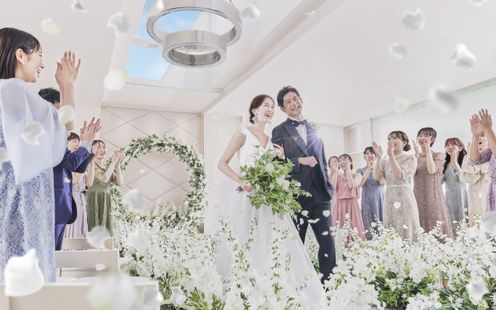 天窓から光が降り注ぐ上品な雰囲気のチャペル。天井に組合せられた白いリングは、「永遠」に続く「縁」をイメージしています。ホテルでは珍しい独立型チャペルで優しい光と親しいゲストに包まれる温かな挙式を。また、和装の人前式も叶いますので神殿と好みの挙式ステージをお選びいただけます。