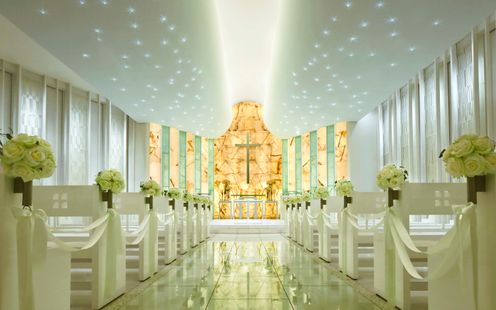 17mものバージンロードの先に待つのは、厳かな十字架と感動の瞬間。