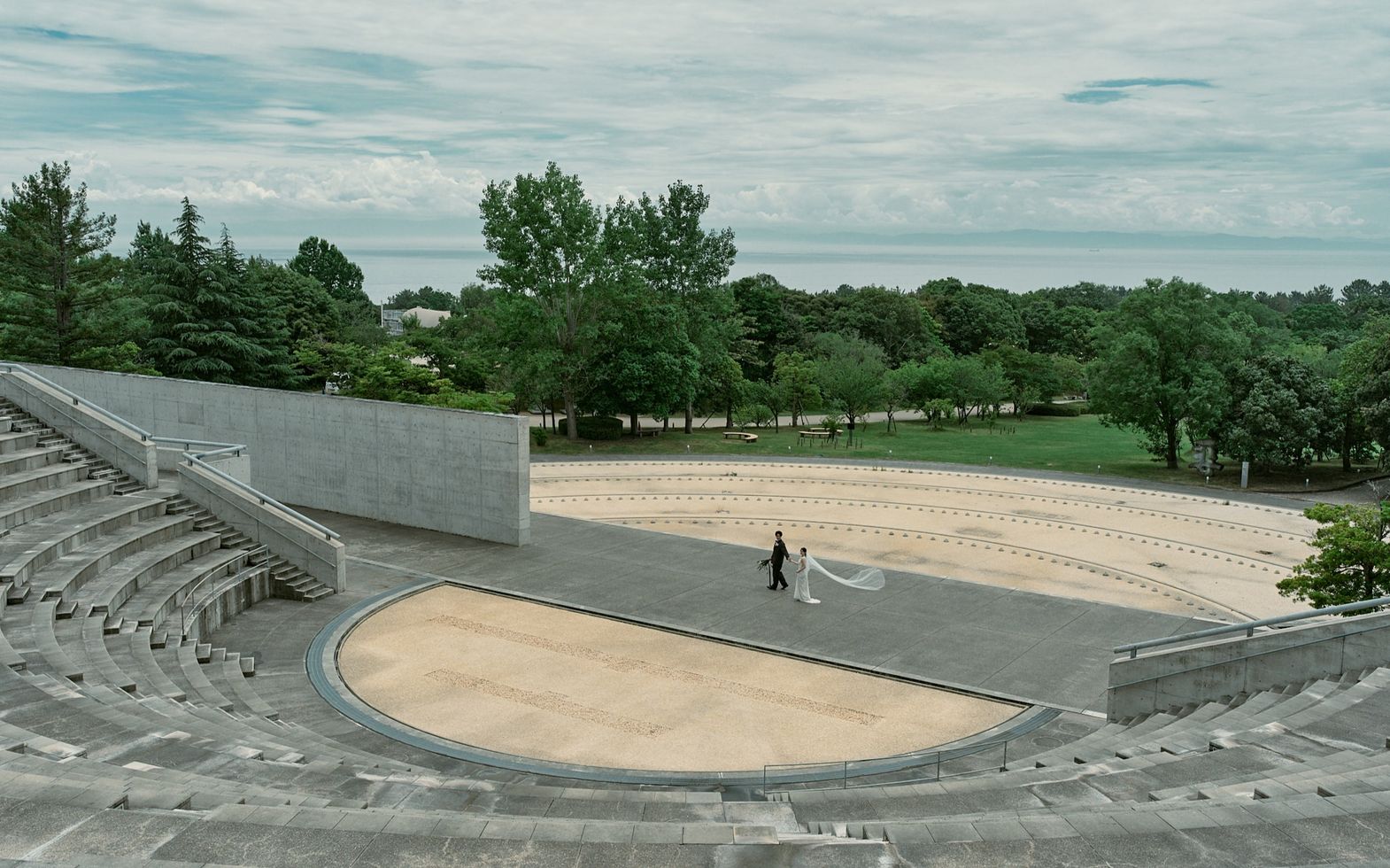 淡路夢舞台の野外劇場は、海と緑に囲まれた開放的なステージ。もともとはコンサートやイベントの舞台として設計され、音響効果やスケール感も抜群。どの席からも見やすく、一体感のあるセレモニーに。