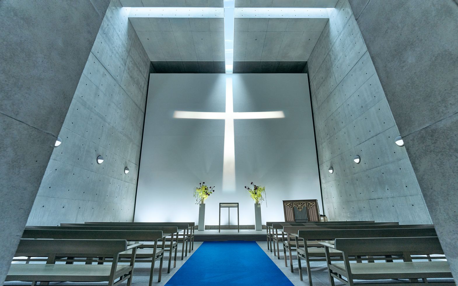 天からの光がまっすぐに差し込み、祭壇に浮かび上がる「光の十字架」が幻想的なチャペル。世界的建築家・安藤忠雄氏が手掛けた、静けさと神聖さが共鳴する特別な空間です。無垢で独創的なコンクリートがおりなす厳かな雰囲気の中、祝福の声に包み込まれます。