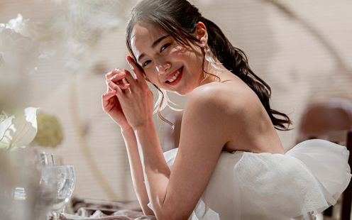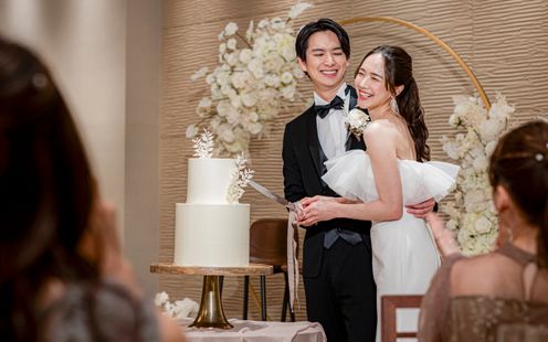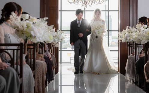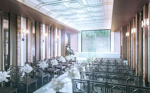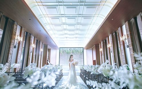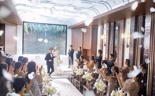 純白のバージンロードと赤レンガのコントラストが、シックでモダンな雰囲気。祭壇奥の陽光を受けて輝く水のせせらぎが、セレモニーをより神秘的に引き立てます。ここではキリスト教式はもちろん、人前式やクラシカルな世界観に調和する和装人前式、提携神社での挙式など、様々なスタイルが実現可能。光と水に彩られた感動的な誓いのシーンをご体験ください。