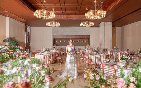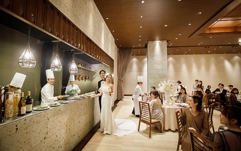 ベージュとブラウンをメインカラーとした落ち着いたトーンの披露宴会場は、上質で優美なひと時を感じさせる雰囲気。会場内にはオープンキッチンがあり、そこで料理の仕上げをするシェフたちの姿もゲストを楽しませる演出となります。美味しそうな香りと共にゲストの元へ届けられる出来立てのお料理は、大切な人たちに贈りたいおもてなしのひとつ。また会場横には専用のホワイエを併設し、デザートビュッフェなどの演出スペースとしても大活躍!美食と会話を楽しむ寛ぎの時間をお過ごしいただけます。また、家族中心の少人数パーティも叶いますので気軽に相談ください。