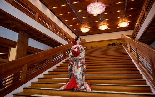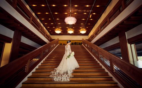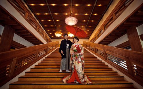 ロビーの大階段は人気の撮影スポットです。ドレス姿はもちろん和装姿も鮮やかに映えます。