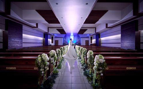 いつか夢みた理想的な本格挙式が叶う、木目調の温かみのある空間です。おふたりを約束の場所へと導くのは光を 受けて白く輝く大理石のヴァージンロード。