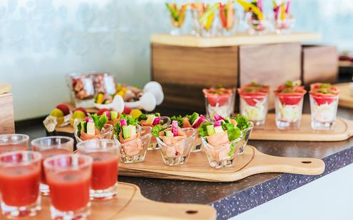 ウエディングケーキはすべてオリジナルのデザインで生地から丁寧に手作りしています。おふたりの好みや希望する気持ちをパティシエがしっかり汲みとり、世界に一つしかないおふたりだけのウエディングケーキを仕上げます。また人気のデザートビュッフェはもちろん、新鮮な海鮮類を取り入れた「お茶漬けビュッフェ」や、おふたりの出身地の特産物や名物を使った地元ビュッフェなど様々なビュッフェスタイルをご用意しております。