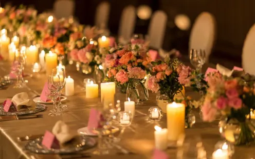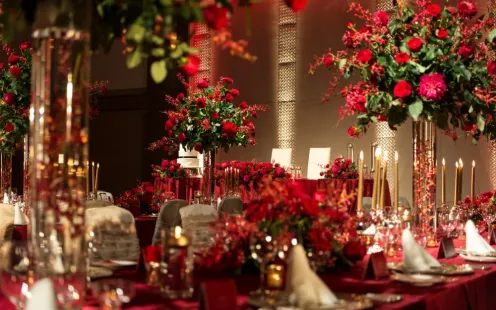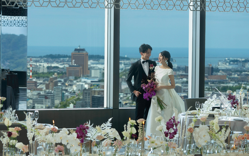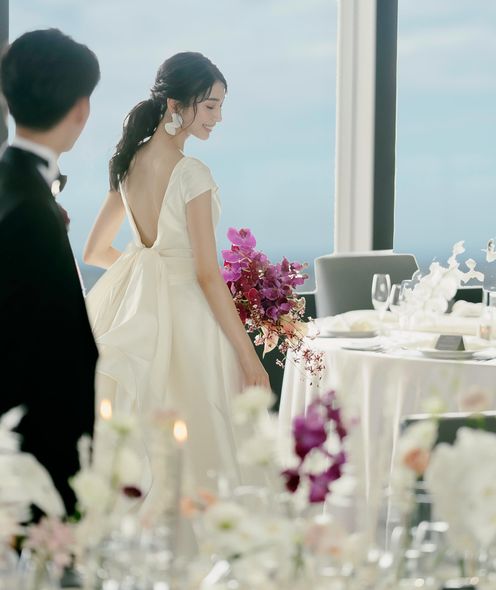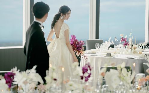 専属フローリストやコーディネーターが、テーマカラーや季節感、ドレスとの相性まで細やかにヒアリング。天井高や眺望、自然光など、各会場がもつ個性を引き立てる装飾で、洗練された世界観を描きます。