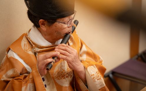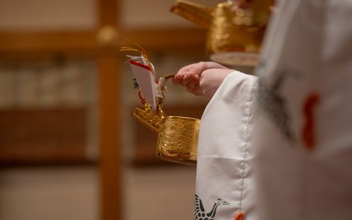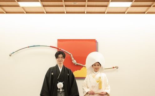 金沢五社のひとつ「安江八幡宮」のご神体を祀った、由緒と格式を備えた神聖な空間です。神殿控室には、水引で施された「結び」のオブジェを設え、これから始まる人生の縁を象徴します。雅楽の調べが厳かに響く中、末永い絆が結ばれます。