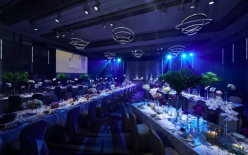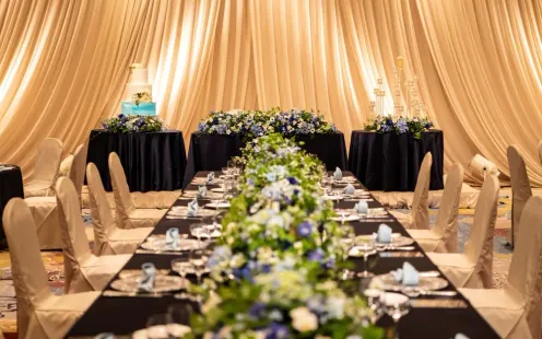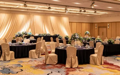 天井高7m、ホワイエを含め約1,500㎡の広さを誇る「鶴の間」は、重厚感あふれる大空間。華やかな披露宴から大規模なパーティまで、あらゆるシーンに対応します。国内外のVIPを迎えてきた実績に裏打ちされた、ホテルならではのクオリティと安心感。細やかなサービスと洗練された設えが、ラグジュアリーさを演出します。