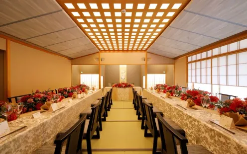 四季折々に表情を変える日本庭園が、ふたりの門出にやさしく彩りを添えます。落ち着いた和の空間で、家族や親しい人と心を通わせるひとときを叶えて。