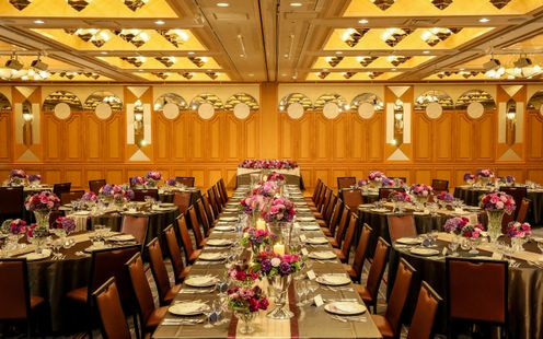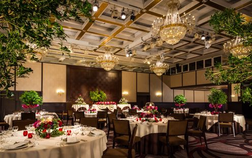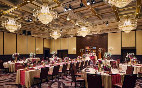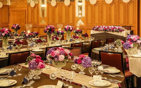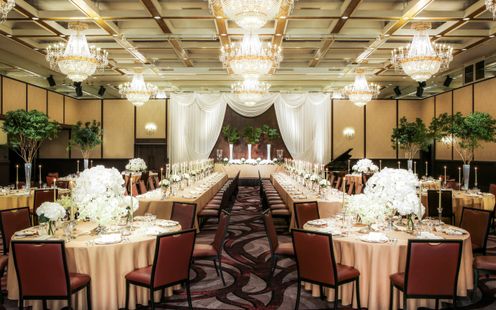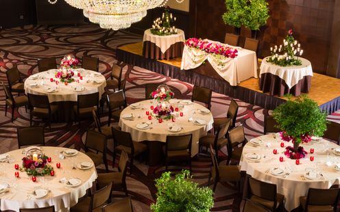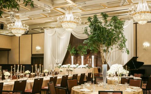 ホテルウエディングらしいフォーマルパーティをご希望のおふたりには、メインバンケット『グランデ』がおすすめです。お招きするゲストへのおもてなしは、おふたりにとって、とても大切な要素。ブエナビスタならではの上質なサービスや優雅な空間を味わっていただきながら、最高の洋和折衷オリジナルキュイジーヌをお召し上がりいただけます。