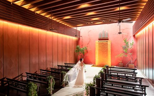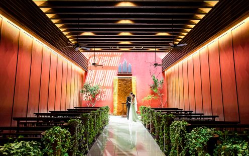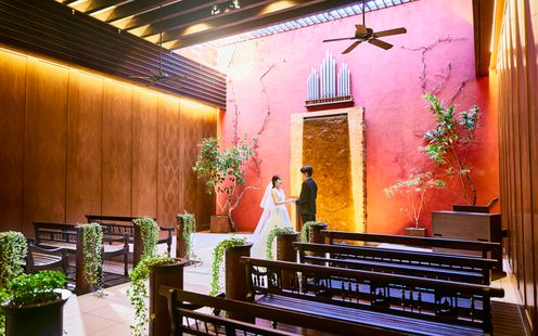 特定の宗教色を持たない独立型チャペル「THE COZY MUSIC HALL」。重厚な扉の先には、ふたりの新しいスタートにふさわしい純白のバージンロード。祭壇の向こうには滝が流れ、静かな水音が優しいBGMに。天窓から降り注ぐ陽光がふたりを照らす誓いのシーンは、自然が作り出した美しさ。神聖で厳かな教会式やゲストに愛を誓う人前式、和装姿でかなえる和婚式など、自由でふたりらしいセレモニースタイルをかなえてください。挙式&アフターセレモニーをさらに印象的なシーンとして楽しめるチャペルとガーデンに生まれ変わっています。おふたりの希望にあわせた様々なスタイルをご提案致します。