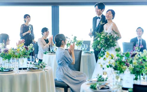 ゲストと同じ目線で過ごすパーティは、大切な仲間とのこころ温かなひととき。懐かしい仲間たちと昔話で盛り上がり、ふたりの笑顔は会場のすべてのゲストへと広がります。カジュアルでありながらもホテルならではの温かみに満ちた空間は、新郎新婦もゲストと一緒に楽しむことのできる、気取らないパーティが叶う場所。季節のデザートブッフェ、オシャレなカクテルバーも、工夫を凝らしておふたりからサーブをすれば、よりいっそうゲストに近づけパーティは賑やかに。ふたりのリビングにゲストをお招きするように、会場コーディネートもふたりらしさをお楽しみください。