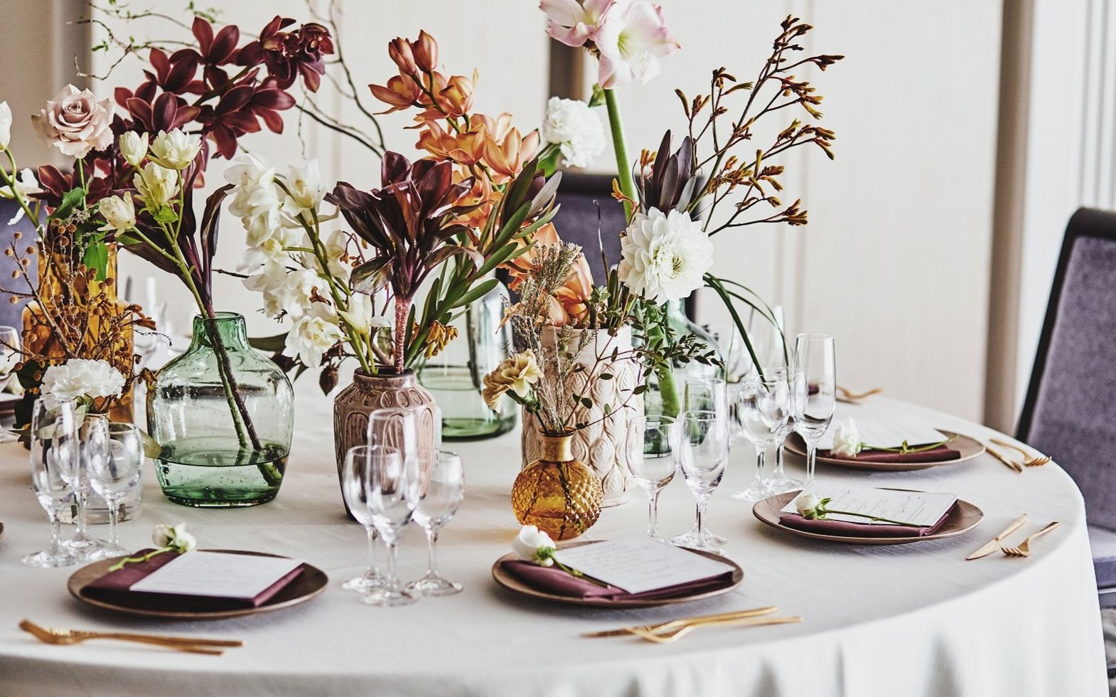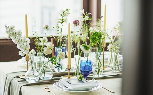お好みの色や花材、テーマに合わせて専属コーディネーターがご提案させていただきます。自然光の入る空間にはナチュラルテイスト、会場に合わせて高さのあるゴージャスなもの、シックで落ち着いた色味のもの、キャンドルを使ったコーディネートなど、ご希望をお聞かせください。