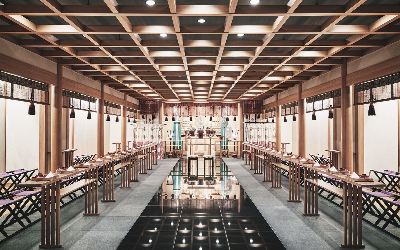 出雲大社の神が祀られた、白木が清々しい本格派神殿で、ゆったりとした趣ある日本伝統のセレモニーを。格調高い雅楽の調べの中、白無垢に身を包み、三々九度の盃で愛を誓う神前挙式は、伝統美あふれるクラシカルなウエディングシーンを演出します。90名まで列席可能ですので、親族だけでなく大切なお友達にもご参列いただけます。