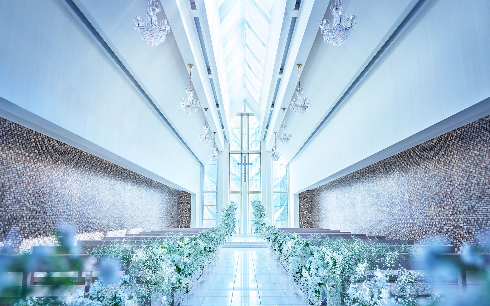 チャペルには、直径85mmのスワロフスキークリスタルを組み合わせて作られた十字架と、ガラスアーティストのパイオニア・野口真里氏による高さ9メートルのガラスウォール。天窓から差し込む虹色の煌めきが、大理石のバージンロードにふりそそぐ幻想的な空間です。