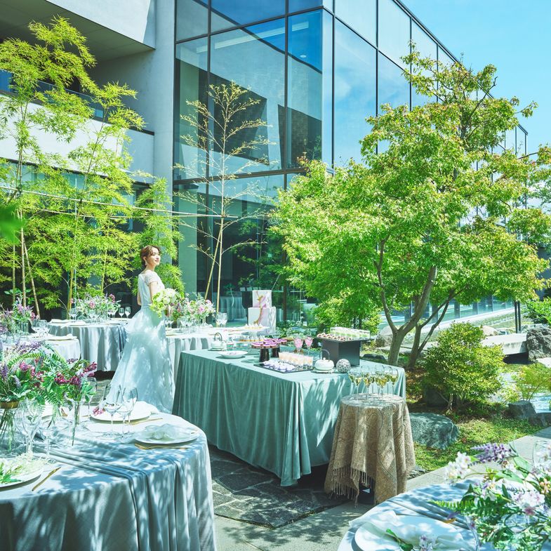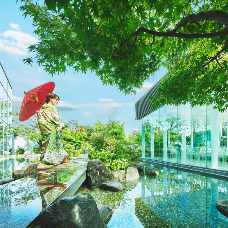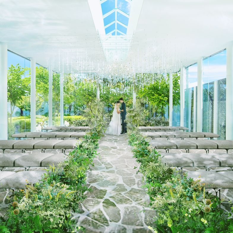 02.<ドレスも和装も似合う>緑・水・光が彩るガラス張りのチャペルでふたりらしい挙式を