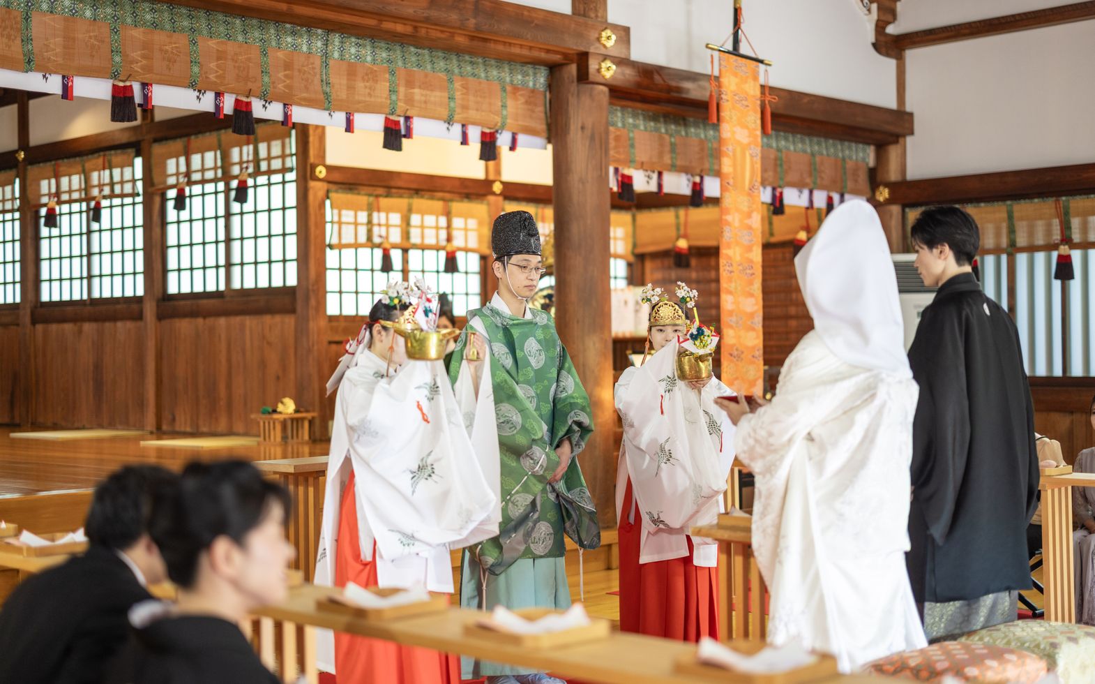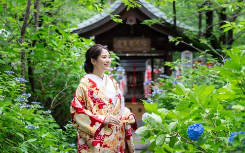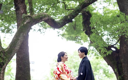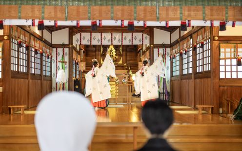 名古屋・栄の喧騒から外れ、緑に囲まれる閑静な境内では四季折々の樹々がゲストをお迎え。1610年、徳川家康公による名古屋城築城に伴い、名古屋の繁栄と守護を祈念して【名古屋総鎮守】となり、遷座410年以上を経た「若宮八幡社」。由緒ある本殿では、花嫁行列からはじまり、巫女の舞や雅楽の調べが厳かな式に彩りを添える、日本の伝統婚儀に則った本格神前式が叶います。また、ふたりのこだわりを取り入れた披露宴会場で行う人前式も可能なので気軽に相談ください。