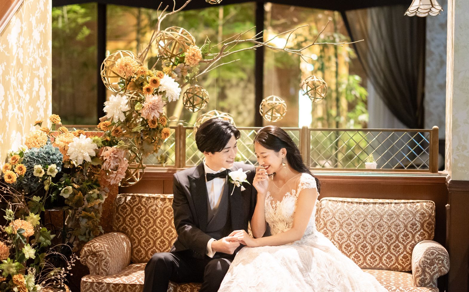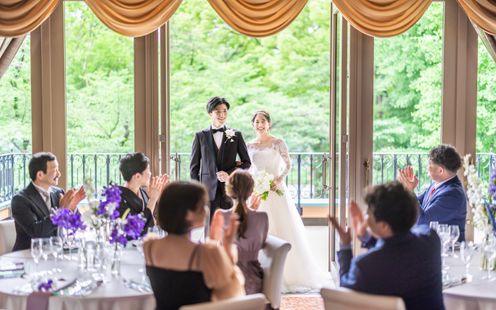 若宮の杜を望む洒落たバルコニーを備え、差し込むやわらかな陽の光の中でゲストの会話にも花が咲くアットホームな空間「桜の間」。イン&アウトと自由に行き来してゲスト同士もリラックスできるパーティをお楽しみいただけます。和洋の両方のスタイルにマッチするのでふたりらしいコーディネートをアレンジしてください。