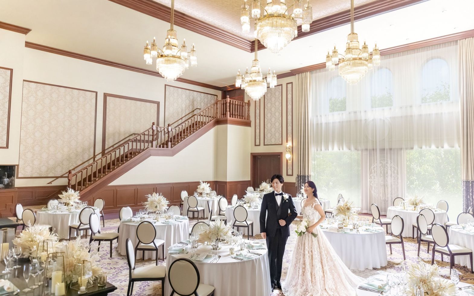 風格ある社殿と繋がる人数で選べる大中小のクラシカルな3タイプのバンケットルームを用意。パーティを鮮やかに照らし出すシャンデリアや、木目を活かした階段&バーコーナーなどクラシカルな雰囲気を醸し出している「橘の間」は3タイプの中で最大の収容規模を誇る空間です。デイタイムは隣接する中庭からやわらかな陽の光が注ぎ込みます。