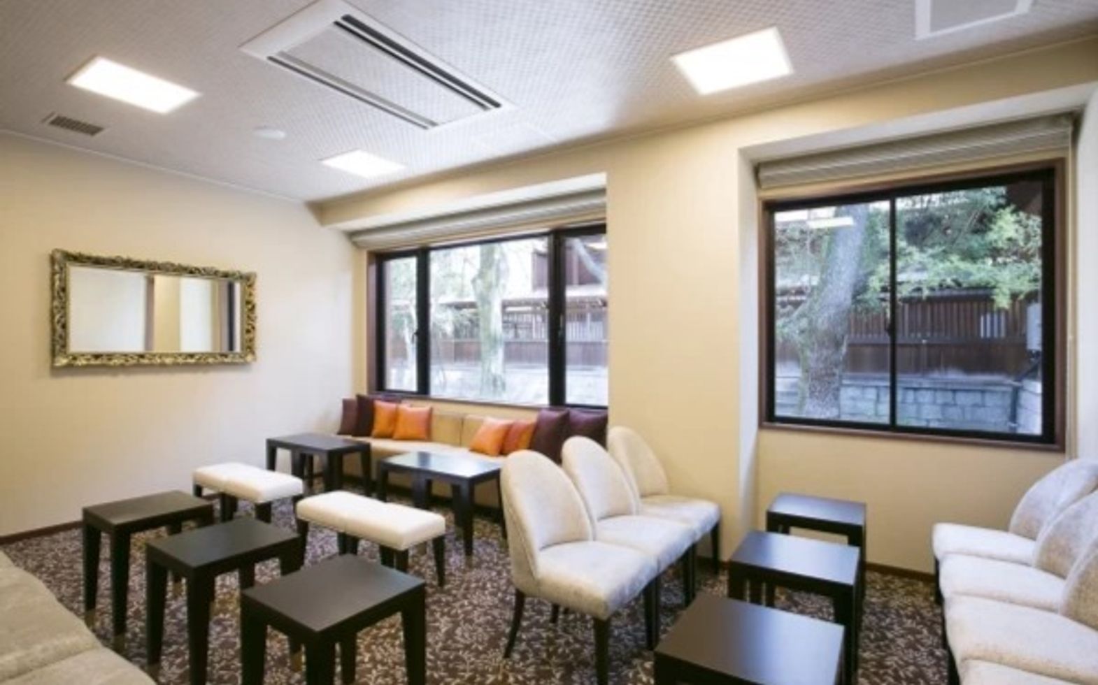 親族控室は趣ある神社の景色を楽しめる広々とした空間です。両家1室ずつご用意します。ゲスト待合スペースは、中庭を望むくつろぎの空間です。