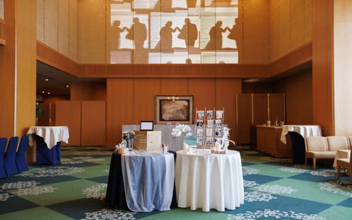 日本の伝統美活かしたシャンデリアが輝く、優雅で広々としたホワイエは花嫁が絵になるスポットです。
