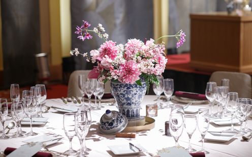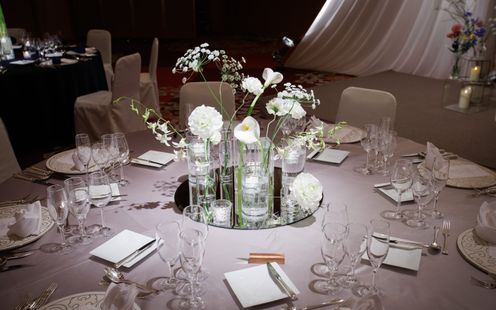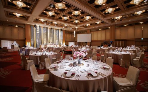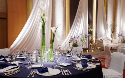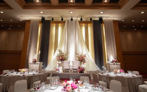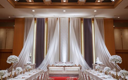 人数よって広さを調節できるホテル自慢のメインバンケットを彩るエレガントなコーディネート