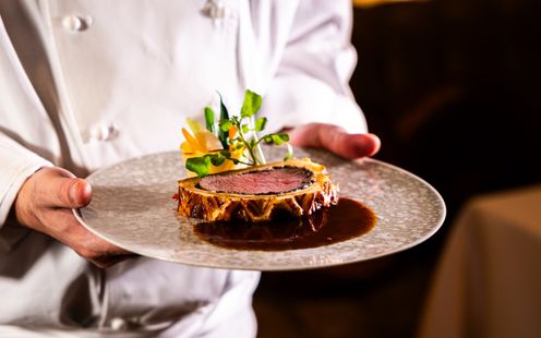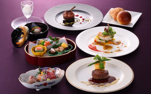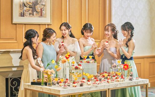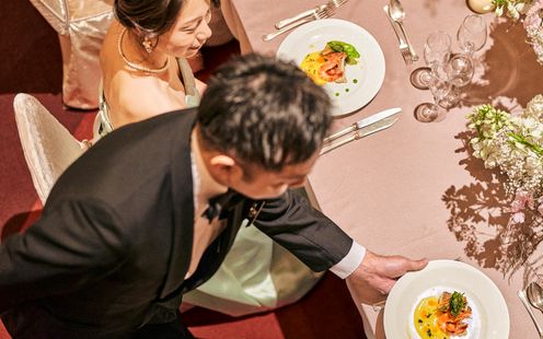 ホテルオークラが誇るフランス料理・日本料理・中国料理それぞれの料理長とパティシエが、お二人とゲストにとっての最幸の一日を演出します。25周年を記念して誕生した10以上のコースメニューの中からおふたりのお気に入りを決めて、そこからメニューの差し替え、また追加やオリジナルメニューを作成するなど、あらゆるアレンジが可能です。フランス料理の最後に手巻き好きビュッフェで和のエッセンスを加えることもできます。また、シェフと相談して一から創る完全オリジナルメニューでのおもてなしも。お肉料理はゲストの目の前での調理パフォーマンスでパーティを盛り上げます。さらに、ホテル内にビール醸造所がありオリジナルクラフトビールを振舞えますので、ビール好きな新郎様にもとても喜んでいただけております。