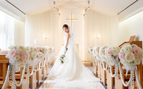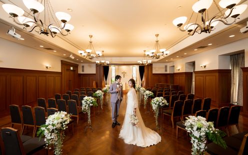 木のぬくもりと鮮やかなステンドグラスが印象的な「プライムチャペル」。両サイドにゴールドを配したロイヤルブルーのバージンロードをアレンジすることも可能で純白のウエディングドレスがひときわ映えます 。静かに踊るキャンドルの無数の炎が、おふたりを幻想的な空間へ誘います。