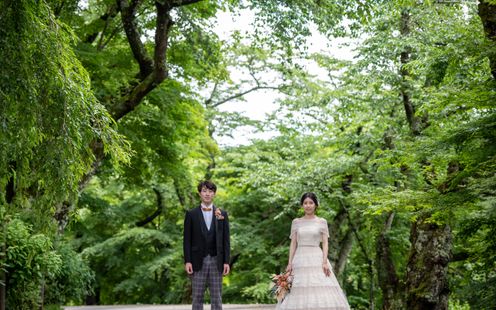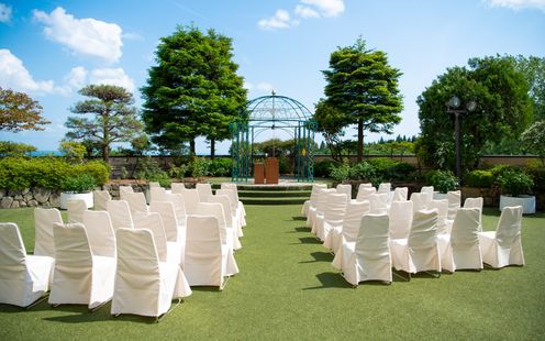 広さ約5,000坪の敷地に約450種6,000株をこえるバラ園では美しいバラをバックに記念撮影がとても人気。純和風旅館「佳松園」敷地内にある日本庭園は、山々に囲まれた自然豊かな背景に篝火と新数奇屋造りの落ち着いた空間が広がる和装にぴったりのロケーションです。チャペル前のローズチャペルガーデンテラスでは青空の下、フラワーシャワーやブーケトスなどゲストと楽しめるアフターセレモニーが叶います。様々なシチュエーションで自然を満喫できる自慢のガーデンを、ゲストとともに当日やステイウエディングでゆったり楽しんでください。
