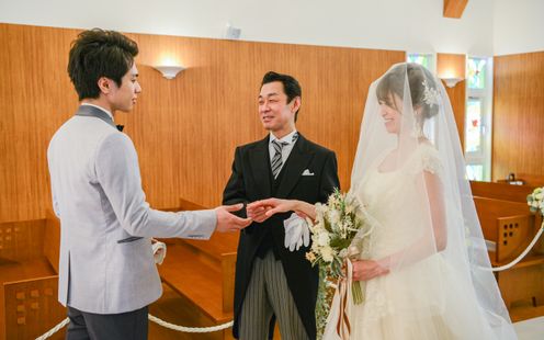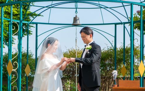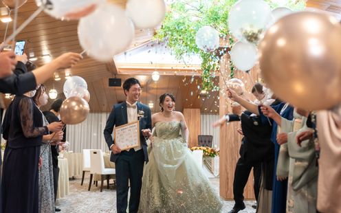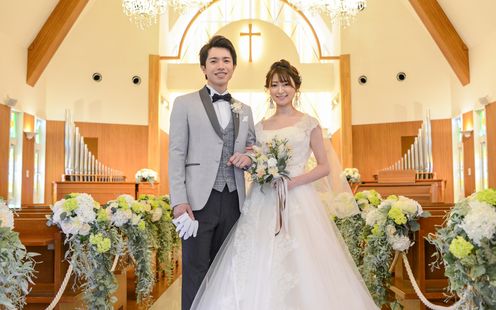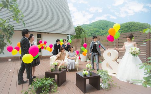 木のぬくもり溢れるチャペルは、日本有数の工房で造られたバラのステンドグラスから差し込む陽の光に包まれた神秘の空間。高い天井にパイプオルガンの音色が美しく響き、バイオリンとフルートも彩を添えます。周囲にそびえる山々を間近に眺望するロケーションもまた魅力。挙式後はチャペル前のガーデンでフラワーシャワーはもちろん、色とりどりの風船を空に飛ばすバルーンリリースも行うことが可能です。