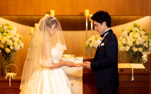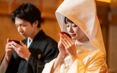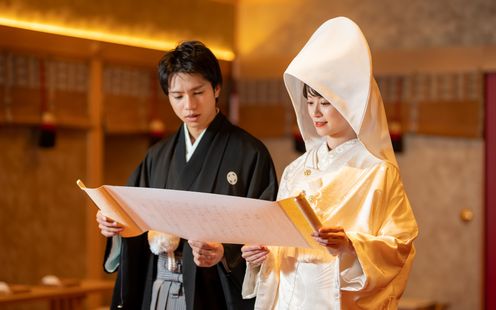 日本の伝統的挙式スタイルで厳かかつ神聖な雰囲気漂う煌びやかな空間が広がる『翔鳳殿』、厳粛な空間を保ちつつも幻想的な輝くを放つ『幸耀殿』と館内に設えたふたつの館内神殿。凛々しくも奥ゆかしい神前式で愛の契りを結びます。古来のしきたりに沿って進められる挙式は、格調の高さを感じさせ、ご本人はもとよりご親族の皆様の胸にも、そのよろこびと感動が深く刻まれることでしょう。