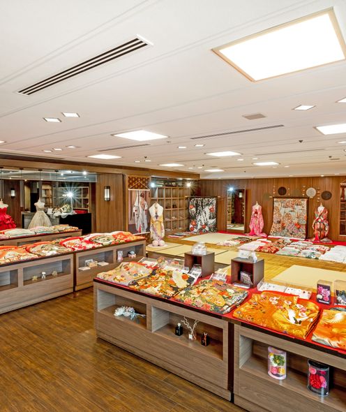 展示エリア約600㎡の全国最大級のドレスサロン「ル・ブランローズ」がインショップとして入っています。常時300着の衣裳を取り揃えており、最新トレンド・有名ブランドドレス、和装、タキシードに加えキッズドレスもご用意。また、フィッティングルームを多数ご用意しておりますので広々とした空間でゆっくりご試着いただけます。ご両親様からご親族、ゲストの着付けなどもお受けできますのでご相談ください。