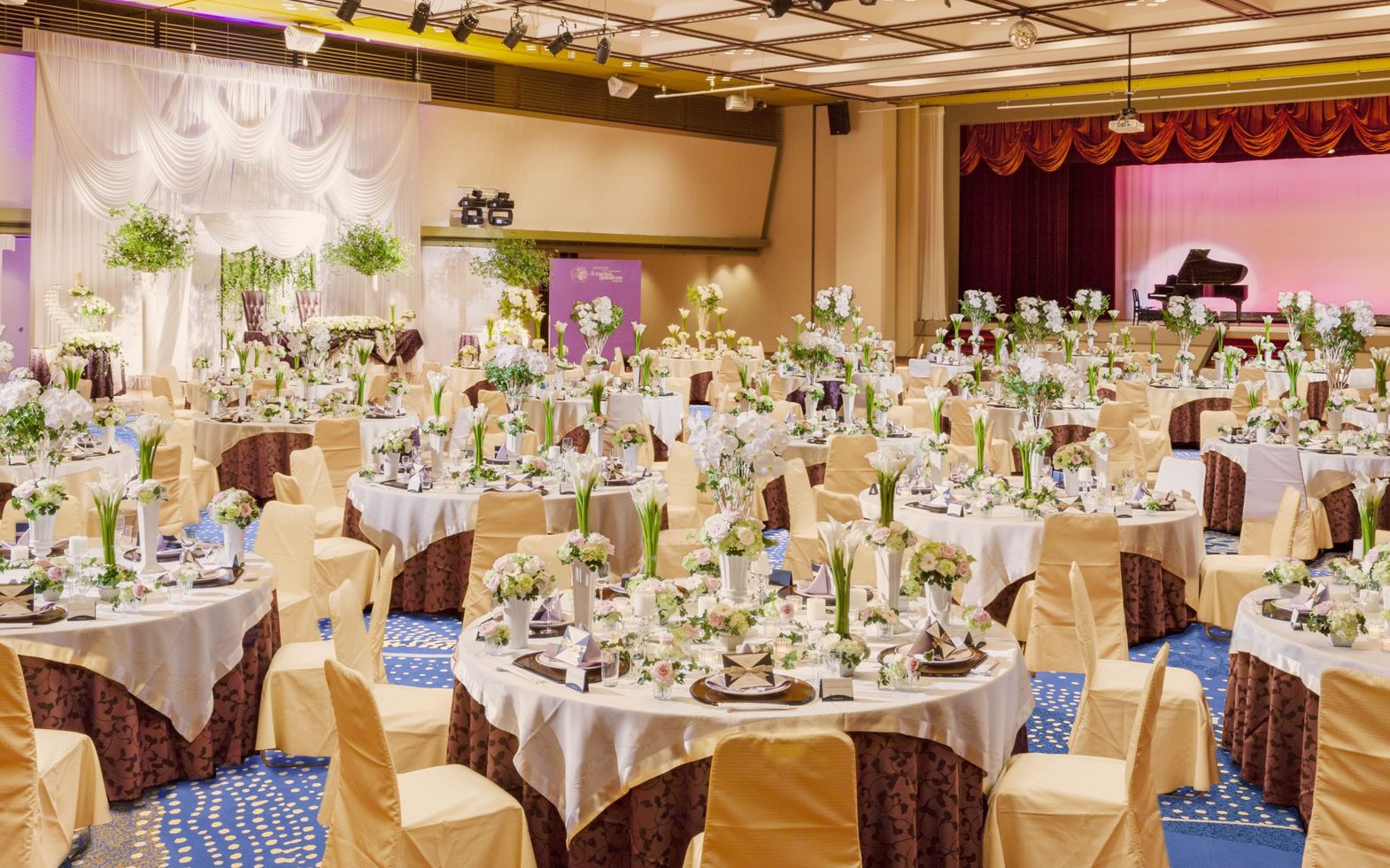 優雅な佇まいが魅力の大ホール。美しく輝くシャンデリアに華やかながらもトーンを抑えたコーディネートは、シックで落ち着いた印象の披露宴を実現します。
