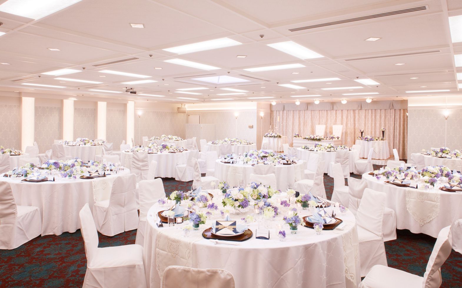 本格ステージを備えた館内一の収容人数を誇る大ホール。会場を半分に仕切り中人数披露宴での利用も可能。天井高い壁面には、全面に映し出せるプロジェクションマッピングでおふたりのシーンを豪華に演出します。