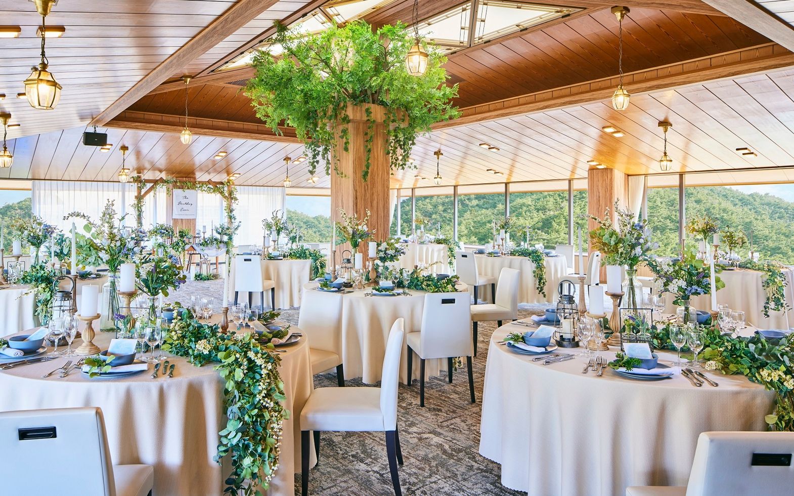 木々に囲まれた心安らぐ空間をコンセプトに作られた『フォレスト テラス』 はホテル紅葉館の最上階にあり、窓に囲まれた開放的な空間で「ナチュラル×カジュアル」なウエディングスタイルを実現します。窓から自然を望み、やわらかな自然の光が降りそそぐ、おふたりとゲスト全員がともにゆったりと和やかな祝福の時間を過ごせる空間です。