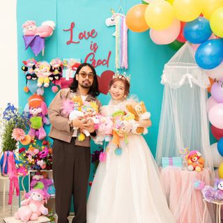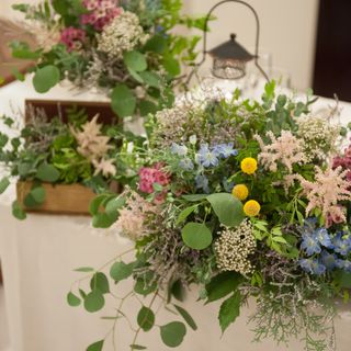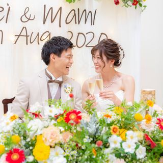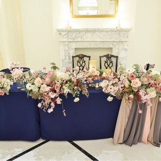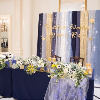 会場自体は真っ白で、テーブルクロスのカラーなどでどんな印象にも変えれると思います!わたしたちは高砂前にリボンカーテンを置いて、ソファタイプの高砂にしました。ゲストとの距離がとても近く、アットホームな披露宴になりました。