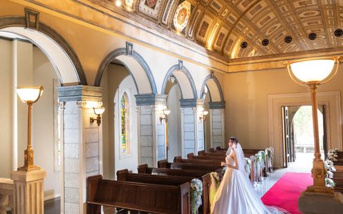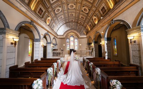 誓いの舞台は、荘厳な雰囲気が漂うロマネスク様式の本格チャペル。美しいステンドグラス、天井絵などの調度品が誓いをより印象的に演出します。挙式後は開放感あふれるガーデンでフラワーシャワーやブーケトス、バルーンリリースなどのアフターセレモニーをお楽しみいただけます。