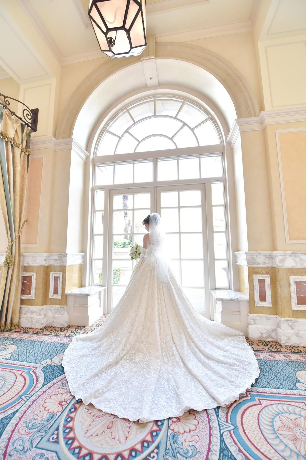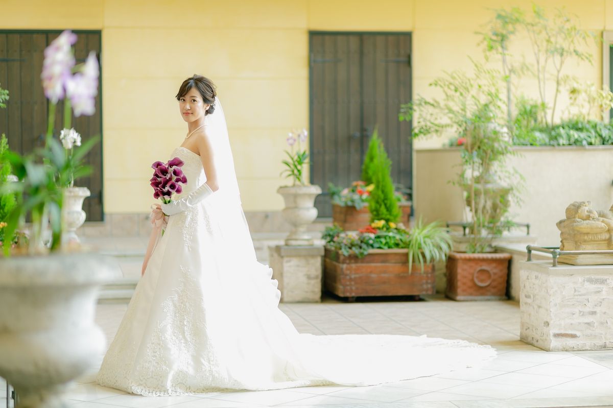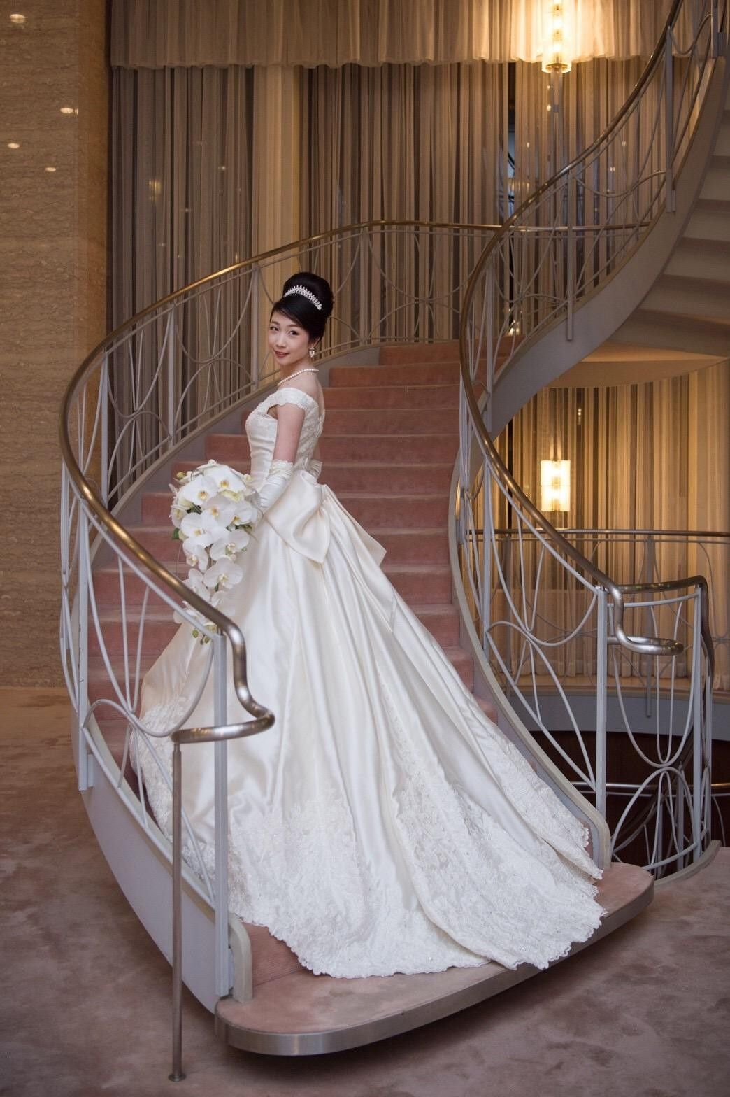 誰もが憧れる王道ラインのウェディングドレス♡ボリュームのあるトレーンがチャペルによく映えます*