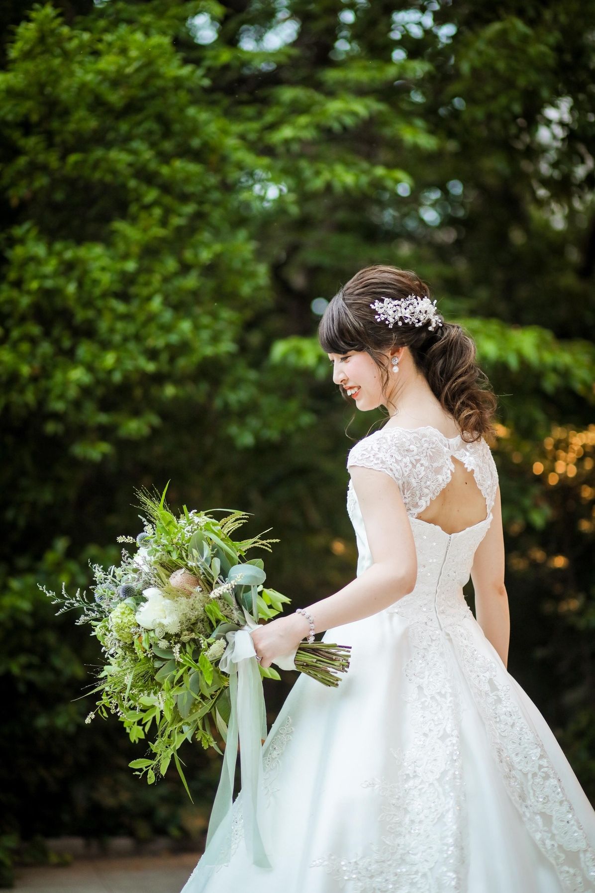 トレーンを外しても、ドレスの後ろ部分の刺繍やデザインがしっかりしているので、披露宴時には外してバックリボンを付けて雰囲気を変えることもできます!