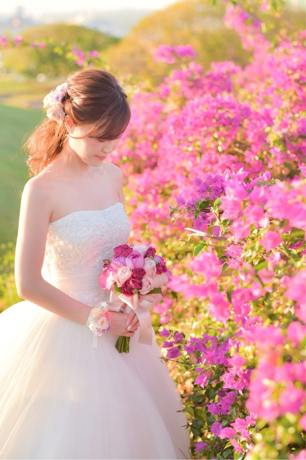 スカートにはピンクやラベンダーのチュールがグラデーションのように重なり、チュール部分にもたくさんお花が付いている360度どこから見ても可愛くて素敵なドレスでした(*´∀`*)♡