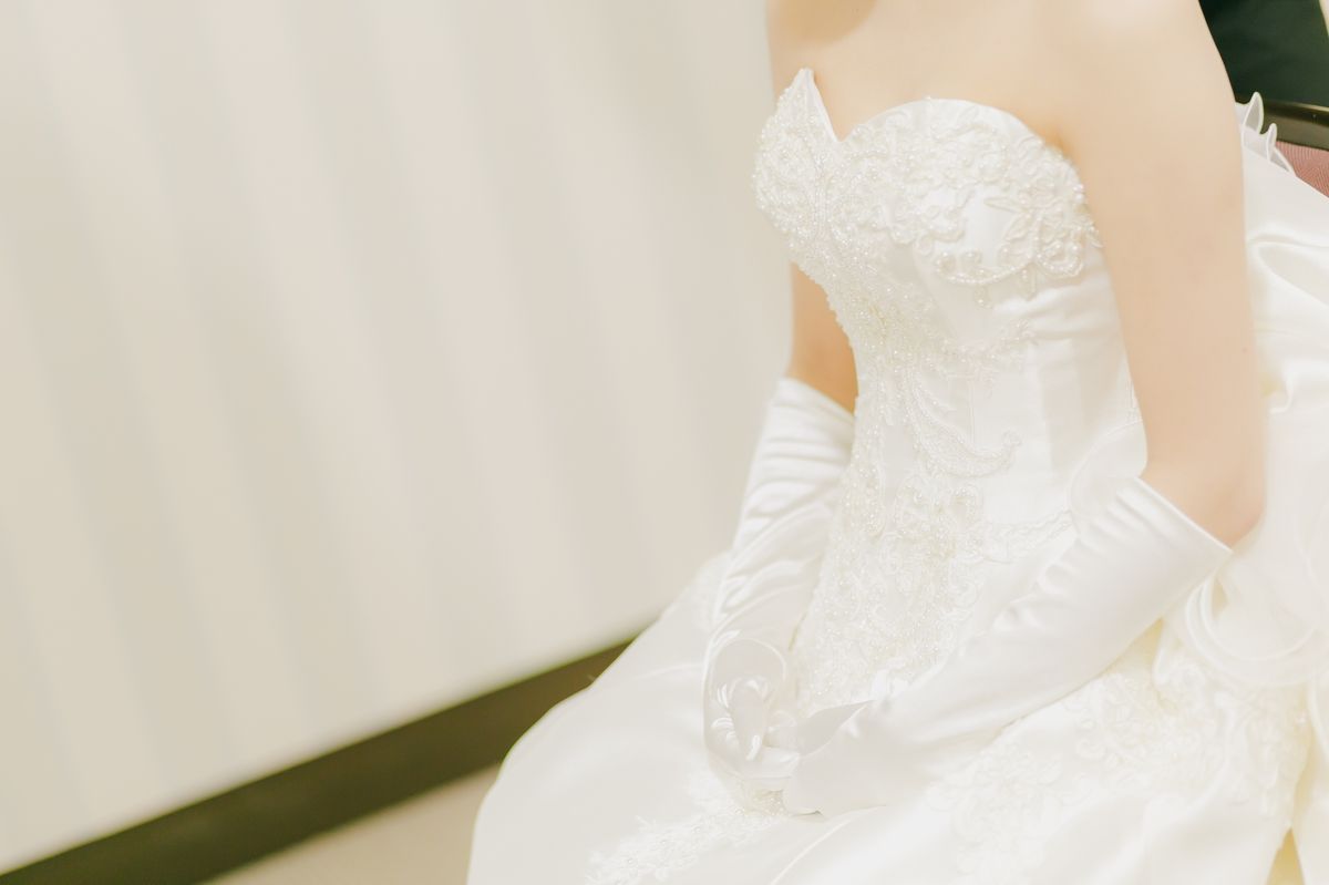 チャペルのアンティークで厳かな雰囲気に合わせるように、サテンのAラインの王道ドレスを選んでいます♡こちらのドレスはパールと金色の刺繍糸で縁取りされています。上品で、当日直接見た人には手の込んだデザインというのが分かります。