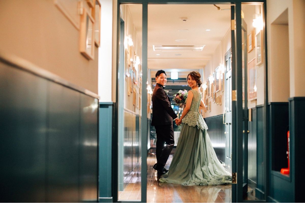 お色直しはドレスショップへ行く前から着ると決めていたというグリーンのドレス♡